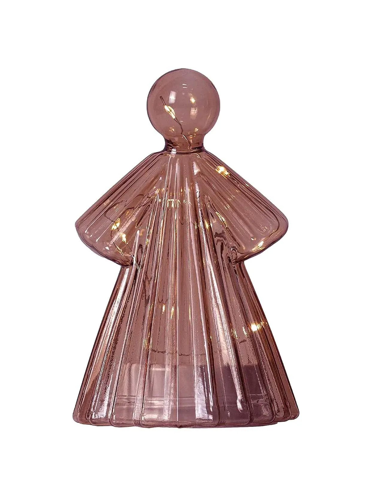 Декоративный ангел Alberte Bordeaux с LED-подсветкой станет настоящим украшением интерьера в период зимних праздников. Стеклянную фигурку можно разместить на праздничном столе или книжной полке, поскольку она не питается электросетью, а работает на батарейках. Легкий теплый свет придает уют и сказочную атмосферу. Стекло с рифленой поверхностью рассеивает свет, создавая мерцающие узоры вокруг. Не подходит для размещения на улице.
