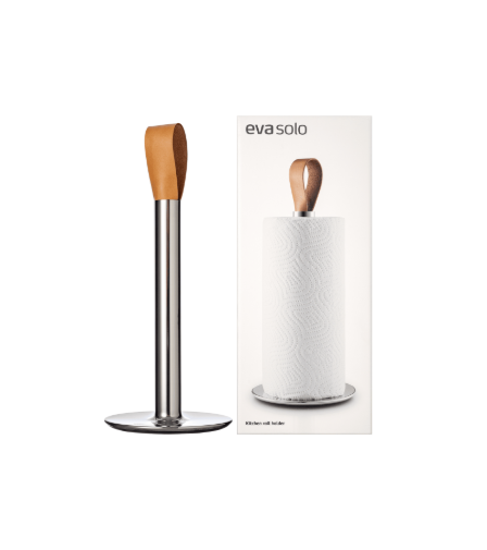 Держатель для кухонных полотенец сочетает скандинавскую эстетику и продуманную функциональность. Подставка изготовлена из нержавеющей стали, имеет декоративные элементы из натуральной кожи и резины. Они придают теплоте и создают текстурный контраст с холодным металлом.
