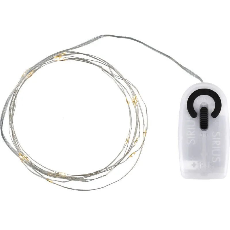 Гирлянда из тонкой прозрачной серебристой проволоки. Предназначена для всех видов декора интерьера и флористических композиций. Теплый белый свет, работа от 2xAA батареи, для внутреннего использования.