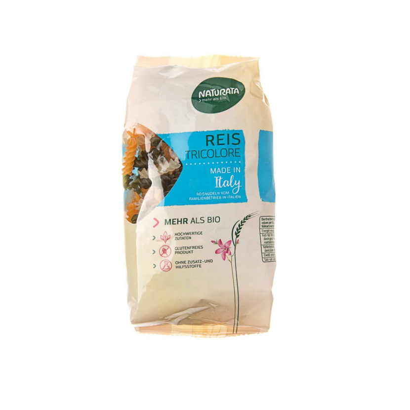 Naturata Рисовая лапша органическая с томатами и шпинатом, без глютена 250г, (Ricepasta in three colors) Органическая трёхцветная рисовая лапша Naturata, содержит в себе порошок из томатов и шпината, выращенных в специальных органических хозяйствах в Италии. Является исключительным диетическим продуктом – не содержит глютена, холестерина, имеет низкое содержание соли и натрия. Подходит для веганов и вегетарианцев. Не йодирована. Будет прекрасно смотреться на Вашем столе, как в качестве основного блюда, так и дополнением. А интересная трёхцветная натуральная расцветка понравится и детям, и взрослым.