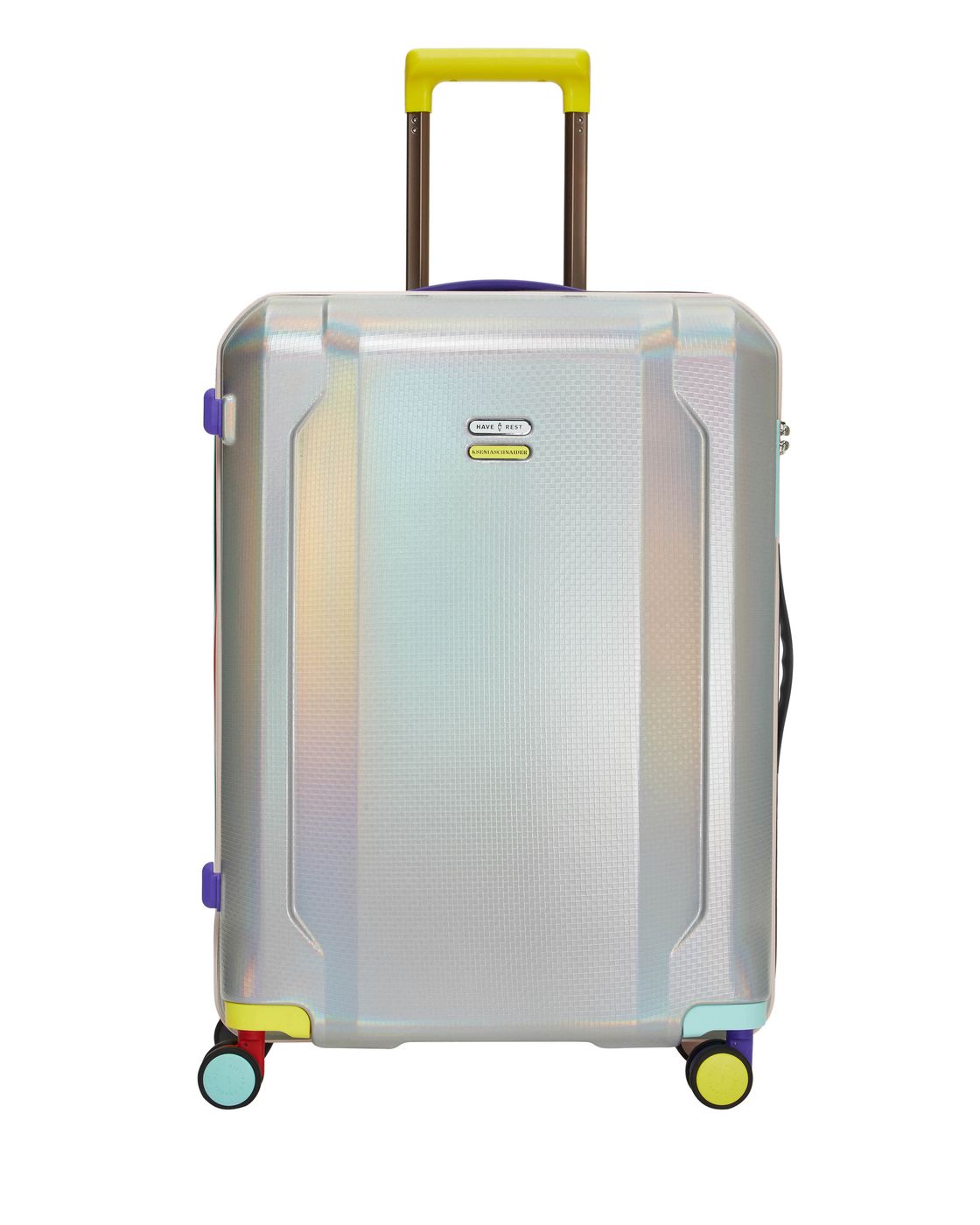 Этот чемодан — настоящий eco-friendly аксессуар. Его корпус с голографическим эффектом изготовлен из переработанного пластика, а именно — из 130 ПЭТ-бутылок.