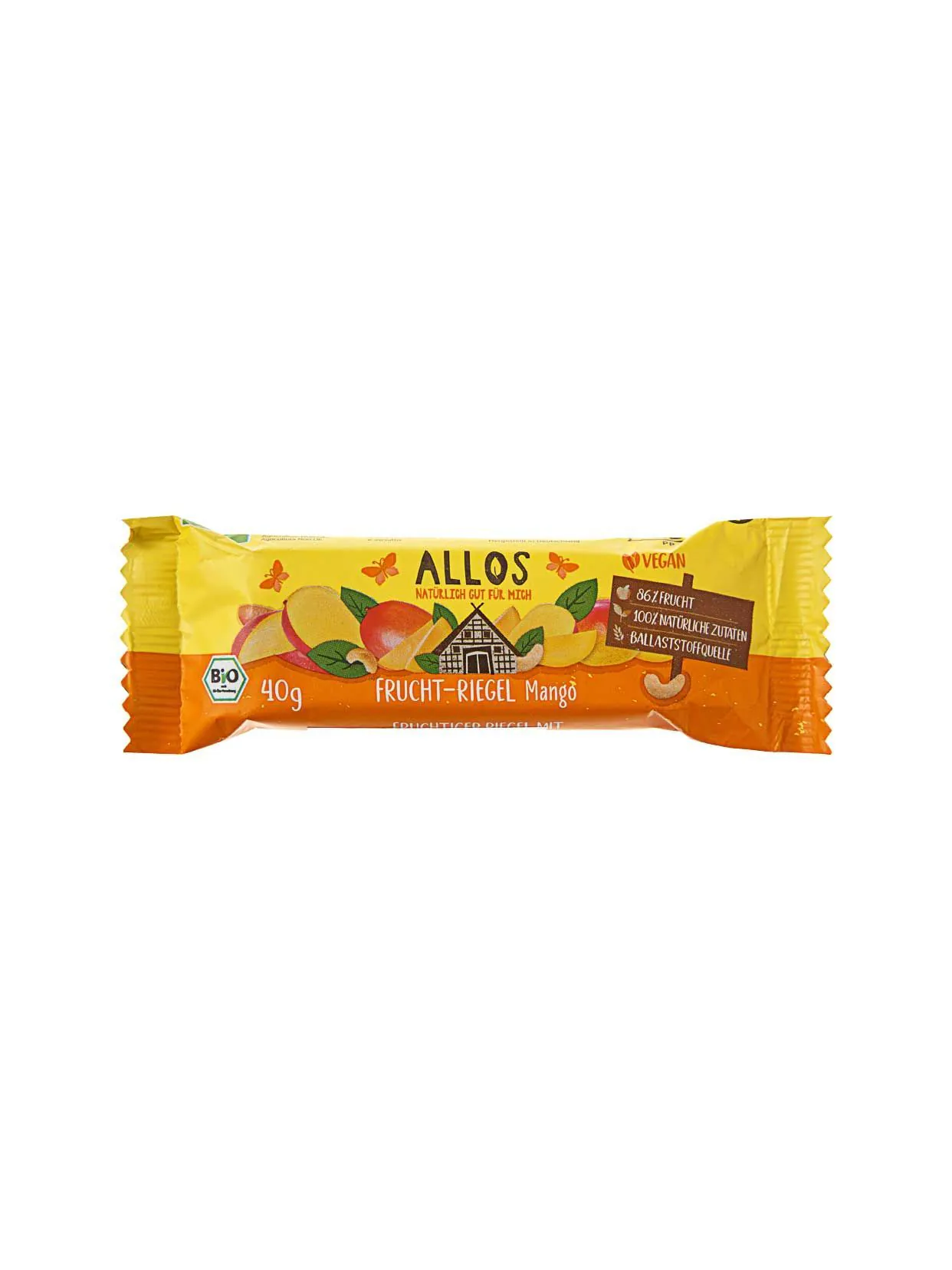 Органічний батончик з манго та кеш'ю німецького бренду Allos поєднує сушене манго, стиглі фініки та ніжні ядра кеш’ю. Завдяки такому складу він має соковиту м’яку текстуру з легкою горіховою ноткою та яскравим екзотичним смаком. Екстракт маракуї додає цій фруктово-горіховий суміші виразний тропічний аромат. Усі основні інгредієнти сертифіковані як органічні та сьановлять 86 % натуральної основи без барвників, консервантів чи штучних підсолоджувачів. Батончик з манго та кеш’ю від Allos добре тамує голод, додає енергії й при цьому залишається легким для організму. А його компактне пакування дозволяє завжди мати під рукою здоровий перекус на роботі, прогулянці, навчанні або в перерві між справами.