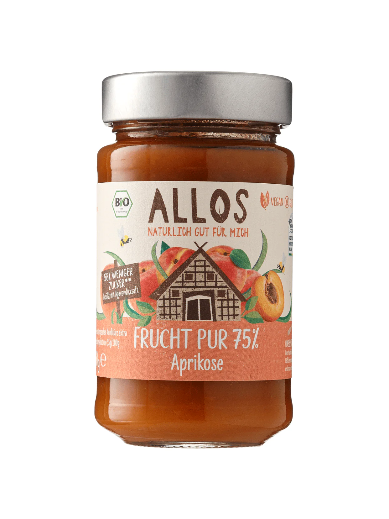 Улюблений багатьма абрикосовий джем виробництва торгової марки "Allos" (аллос) виготовлений виключно з натурального фруктового сировини органічного походження. Він має приємну досить густу консистенцію, тому легко намазується на тости, солодкі грінки, хрустке печиво або хлібці, а також підходить для подачі з млинцями, сирниками і іншими традиційними стравами. Органічний джем з абрикосів від німецького бренду "аллос" прекрасно поєднується з молочними продуктами, гарячими напоями (чаєм, кавою), підходить для приготування домашніх десертів (перш за все випічки) або використання в якості натурального підсолоджувача. Скляна банка надійно захищає продукт від зайвої вологи і сторонніх запахів, сприяє правильному зберіганню.