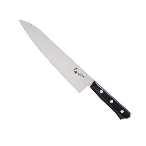 Ніж шеф-кухаря зі сплаву нержавіючої сталі і молібдену AUS 8A з тонким лезом, викованим вручну, має невелику опуклість, яка легко шліфується. За японською традицією леза ножів Zanmai виготовляються з опуклим краєм — ідеальним для нарізання продуктів харчування, оскільки така форма забезпечує вкрай гострий ріжучий край, зберігаючи при цьому максимальну міцність леза. Баланс леза підтримується пропорцією 6: 4 товщини основи до ріжучого краю леза. Цей ніж відносно низької твердості легко заточити самостійно, і він менш чутливий до щербин, чим ножі з більш високою твердістю.Рукоятка виконана з темної деревини пакка (спресованої і ламінованої деревини з фенольної смолою), яка забезпечує опір впливу води і екстремальних температур, з нікелево-срібними кріпленнями для більшої надійності. Для заточування лез використовуються тільки новітні машини, а кут заточування становить 15 градусів. Найбільш важливим кроком у процесі виробництва є забезпечення найкращого стану леза до остаточної окантовки, а саме — фінальна заточка за допомогою точного шліфування.