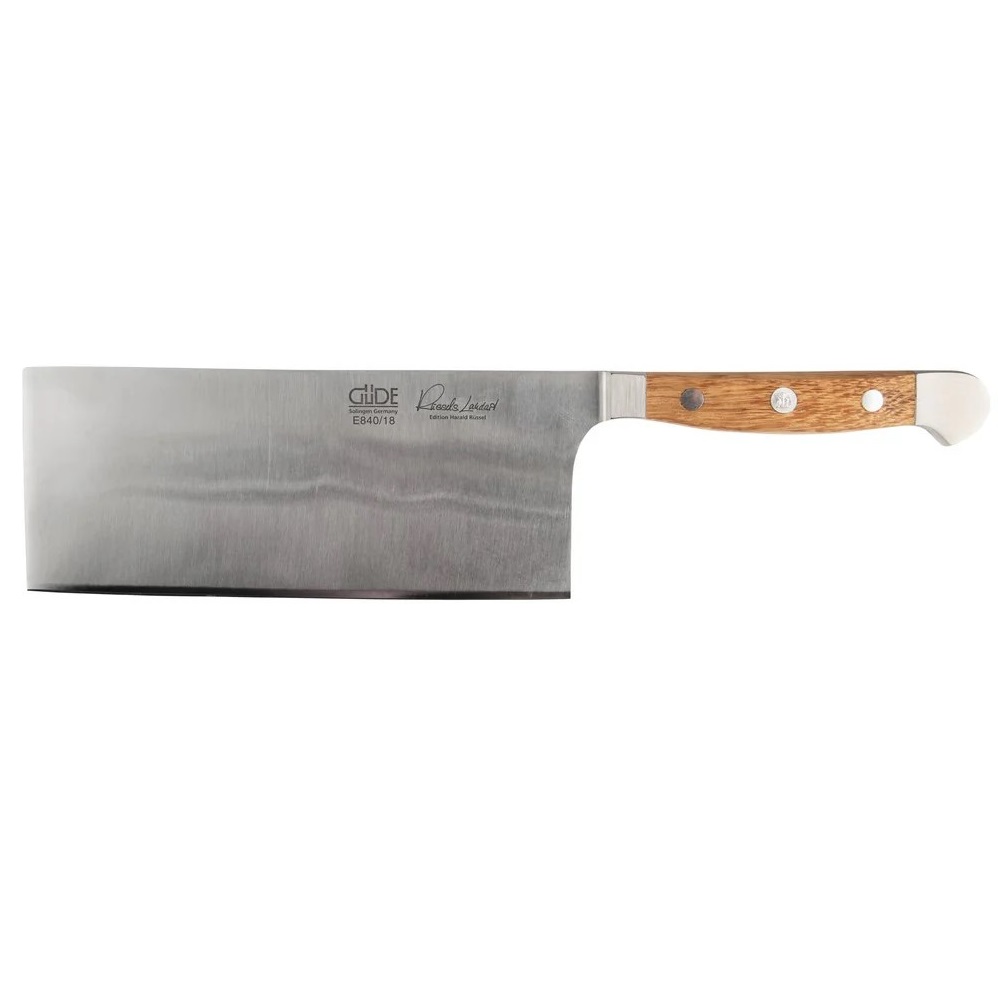 Ніж-тесак Güde Alpha з прямокутним лезом 18 см. Призначення — робота з м'ясом, рибою, овочами, разрубка кісток. Бічну частину можна використовувати для роздавлювання продуктів. Матеріал — кована нержавіюча сталь з додаванням хрому, ванадію і молібдену. Інструмент виготовляється вручну. Рукоятка — 80-ти річний бочковий дуб, міцний немов залізо завдяки багаторічній витримці. Ідеальне балансування ножа і продуманий дизайн гарантують не тільки естетичне задоволення від процесу приготування їжі, але і довгий термін служби. Мити вручну. Бренд Güde існує понад 100 років і відомий у всьому світі за винахід серрейторного леза — хвилястої кромки для нарізки хліба. Компанія спеціалізується на виробництві професійного кухонного інвентарю преміум-якості. Уся продукція виготовляється вручну.