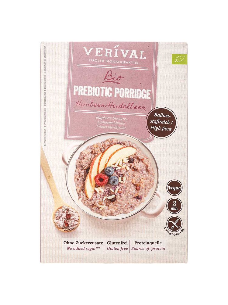 Органічна вівсянка з пребіотиком, малиною та чорницею від Verival — це корисний сніданок, який поєднує в собі позитивні якості вівсянки, фруктів та пребіотиків. Вівсяна крупа є джерелом клітковини, яка добре впливає на шлунково-кишковий тракт людини. Пребіотики, які містяться у продукті, сприяють росту корисних бактерій у кишечнику. Це позитивно впливає на імунітет людини та загальний стан здоров'я. Сухі ягоди малини та чорниці є джерелом вітамінів, надають вівсянці солодкого смаку. Сто грамів пробіотичної каші від Verival забезпечує 50 % відсотків денної норми клітковини та 20 % норми білку. Австрійський бренд Verival спеціалізується на виробництві органічних натуральних продуктів харчування, особливо в сегменті сніданків. Компания пропонує широкий асортимент, включаючи мюслі, гранолу, вівсянку та інші здорові суміші для поживних сніданків.