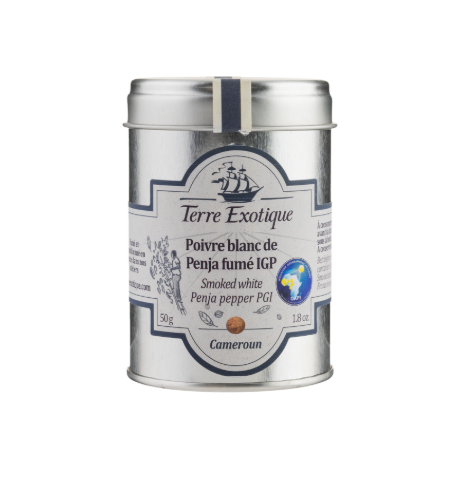 Перець білий копчений з Пенджі (Камерун) від Terre Exotique — це преміальна спеція з виразним характером і глибоким ароматом. Вирощений на вулканічних ґрунтах Камеруну, перець відомий своєю високою якістю та складним смаковим профілем.