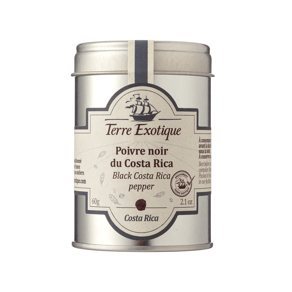 Чорний перець, вирощений у вологому кліматі Коста-Ріки, має насичений пряний аромат з грибними та деревними відтінками. Велика концентрація пиперину робить цей сорт особливим. Перець чудово підкреслить яскраві насичені страви, додаючи пряної гостринки та збуджуючи апетит. Для бренду Terre Exotique важливо пропонувати споживачам високоякісні спеції, тому перець вирощують у природних умовах. Клімат і ґрунт Коста-Ріки забезпечують насиченість та автентичний смак чорного перцю. Перець можна змолоти у спеціальному млинку або просто у ступці, регулюючи розмір часток. Для маринування і запікання краще використовувати крупний помел, тоді як для фінального штриху варто зменшити частки до мінімуму. Так смак розкривається краще.