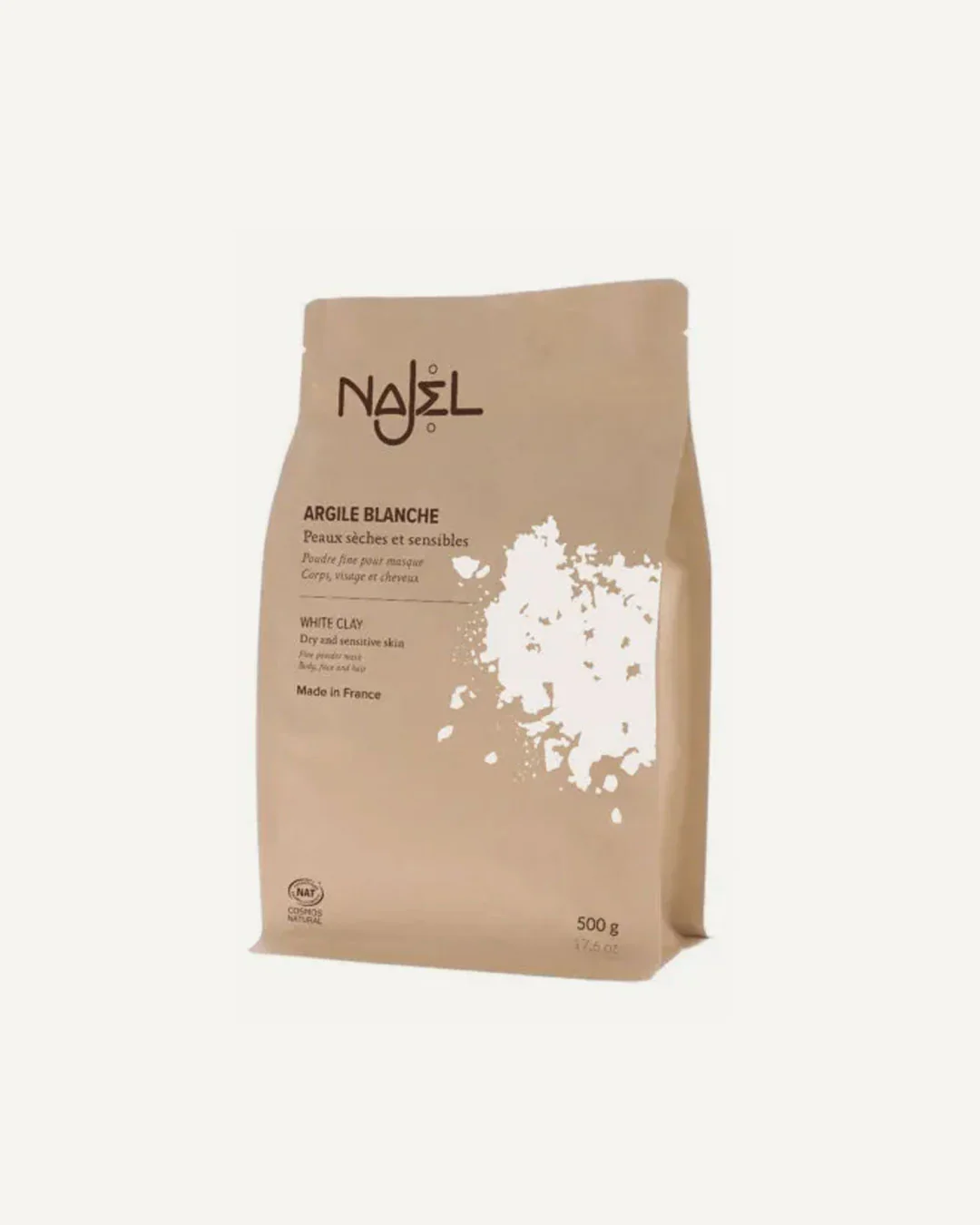 Біла глина NAJEL, видобута з кар’єру в Оверні у Франції, є на 100% натуральною.