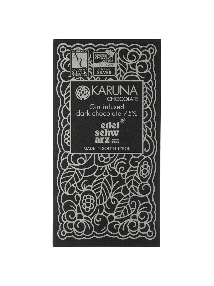 Органічний темний шоколад на 75% виготовлений із какао сорту Chuncho із Перу, настояного на органічному джині Edelschwarz.