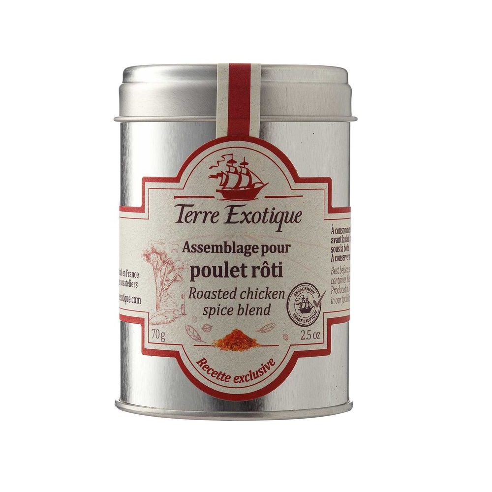 Суміш спецій для смаженої курки від Terre Exotique — це органічна приправа, створена з низки інгредієнтів: паприки, часнику, чебрецю, розмарину, каєнського перцю чилі та солі. У складі немає штучних консервантів, барвників, ароматизаторів і підсилювачів смаку, адже французький бренд Terre Exotique ретельно відбирає компоненти для своїх спецій. Компанія співпрацює з невеликими виробниками з різних куточків світу, які вирощують рослини за принципами екологічного землеробства. Усі спеції пакуються в герметичні металеві банки, що дозволяє зберігати їхні оригінальний смак і аромат. Суміш спецій для смаженої курки має насичений смак, що в якому гармонійно поєдналися гострота каєнського перцю, пікантність часнику та трав'яні нотки розмарину й чебрецю. Аромат виразний, з яскравими пряними відтінками. Перед приготуванням курку можна панірувати у приправі або ж замаринувати в суміші спецій та олії. М'ясо, приготоване з цією сумішшю, зберігає соковитість. Приправа ідеально підходить для страв, смажених на сковороді, в духовці або на грилі.