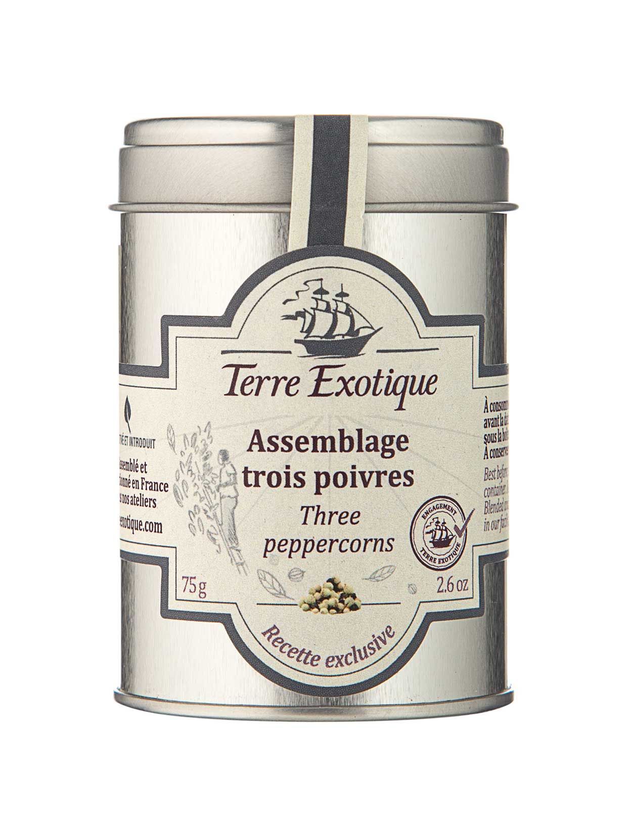 У складі суміші — білий (60%) і чорний (35%) перці з Камеруну, а також зелений перець (5%) з Мадагаскару. Бренд Terre Exotique виготовляє виключно органічні спеції, що дозволяють передати автентичні смаки страв із різних куточків світу. Сировина закуповується у фермерських господарств, які дотримуються методів екологічного землеробства. Ця суміш перців підходить до страв із червоного м'яса та риби, приготованих на грилі. Білий перець надасть їм легкого деревного присмаку, чорний забезпечить яскраву пікантність, а зелений привнесе свіжість із тонким трав’яним відтінком. Продукт не містить штучних ароматизаторів, консервантів і підсилювачів смаку. Також суміш трьох перців із Пеньї добре поєднується з десертами: грушевим пирогом, ванільним морозивом, ананасовою панакотою та полуницею з лаймом.