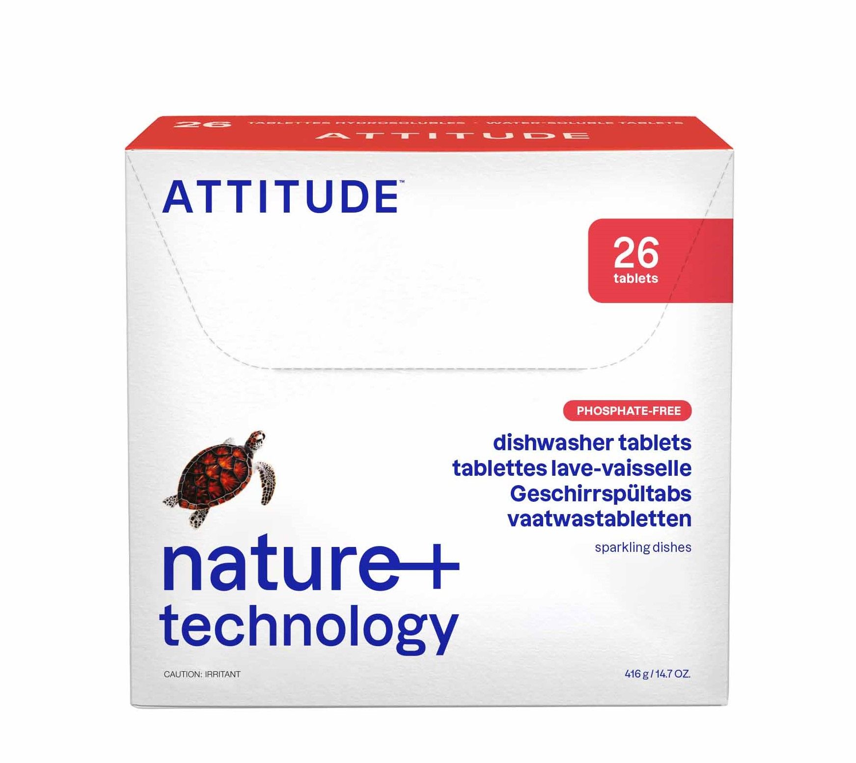 Усе, що ми виливаємо в раковину сьогодні, завтра з'явиться в наших річках, водоймах і знову в нашому водному змішувачі. Таблетки для посудомийних машин ATTITUDE виготовлені з рослинних і мінеральних матеріалів, не містять фосфатів та безпечні як для вашої родини, так і для навколишнього середовища. Таблетка швидко розчиняється у воді, не залишаючи на посуді і деталях машини сольового нальоту, водного каменю і накипу. ATTITUDE – це натуральна, екологічна, біорозчинна продукція, творці якої в рівній мірі піклуються про здоров'я людини і про нашу планету. Її виробництво не пов'язане з викидом вуглекислого газу в атмосферу, що дозволило сертифікувати компанію як «вуглецево нейтраль