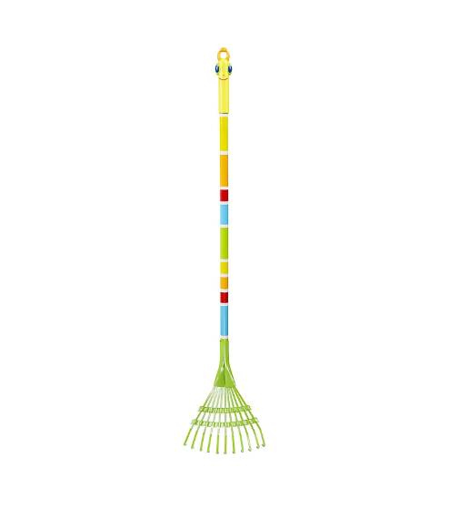 Такими віяловими граблями зручно прибирати листя в саду, вони мають яскраву смугасту дерев'яну ручку. Ці яскраві граблі сподобаються і хлопчикові і дівчинці.